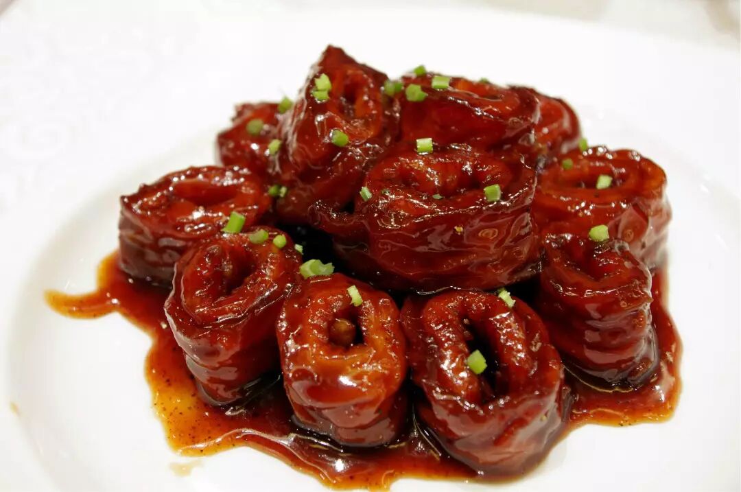 九转大肠,原名红烧大肠,山东济南传统名菜之一。在烧制过程中需要辅以十多种作料,并用微火炮制完成,吃起来是酸、甜、香、辣、咸五味俱全,色泽红润,质地软嫩。